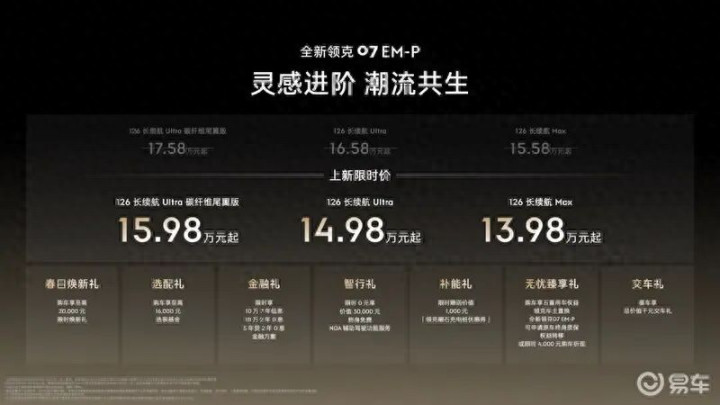 全新领克 07 EM-P 碳纤维尾翼版崇拜上市,官方联接价 17.58 万元,3 月限时专享价 15.98 万元起,同期领克 07 EM-P 全系同步放出限时福利,初学版车型限时价径直下探到 13.98 万元。