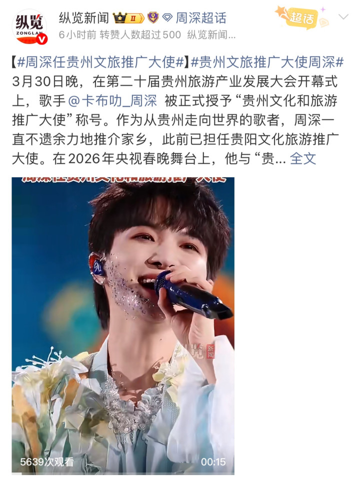 3月30日,周深在第二十届贵州旅游产业发展大会开幕式上被认真授予“贵州文化和旅游履行大使”称呼。