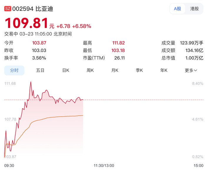 3月23日,比亚迪(002594.SZ)开盘即高涨,盘中涨幅一度超8%,公司总市值重回万亿元区间。戒指发稿,比亚迪涨6.58%,报109.81元/股。