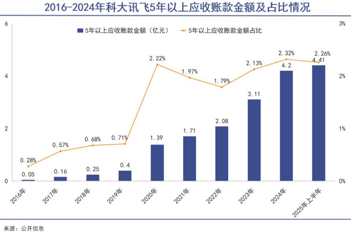 而账期在五年以上的应收账款金额,在近十年内增长了87倍,占比则从0.28%增长至2.26%。为此,2025年上半年,科大讯飞应收账款的坏账准备还是高达37.72亿元。