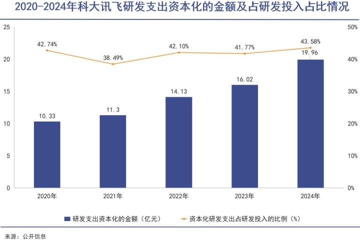 这致使如故报表好意思化后的效用。历久以来,科大讯飞研发用度成本化的比例赓续保持在40%摆布,这么的操作也极地面缓解了利润端在纸面上的“压力”。这种处理姿色不错在短期内好意思化利润数据,但本体是“寅吃卯粮”——成本化的研发参预需在畴昔数年摊销,若联系模样未能完结预期营业化收益,不仅摊销会赓续连累利润,还需计提钞票减值。