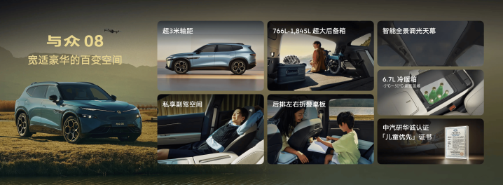 细节成立上,与众08配备了6 7L智能冷暖静谧雪柜,温度可在-5℃至50℃之间解放转念;还有1.74㎡的超大智能光感天幕、RGB无级可调环绕氛围灯、UNYX SOUND高档音响系统等成立,营造出适意愉悦的驾乘氛围。