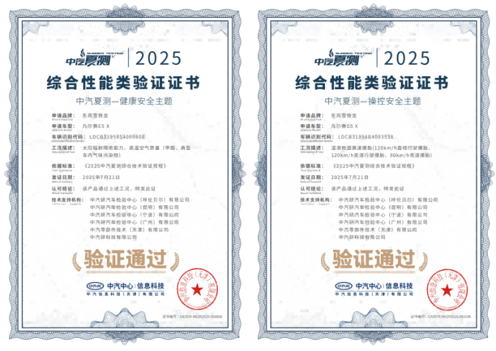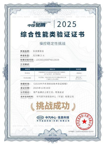 凡尔赛C5 X曾荣获中国十佳车身、C-NCAP五星安全认证、中汽研“驾乘品性之星”等巨擘背书。2023年5月,凡尔赛C5 X 挑战国内初次高速连环追尾主被迫安全议论测试,以12项考据神志全部及格通过的优秀收成,取得“3A”评价;2025年7月,在2025中汽夏测中通过太阳辐照拒绝才智、高温空气质料及湿滑路面高速爆胎三大测试神志,荣获健康与操控双安全巨擘考据文凭;2025年12月,在中汽中心极寒驾控安全主题本事考据中,以140km/h时速在压实雪面完成前轮爆胎测试,在20%坡度的冰雪路面上满载情状一次登顶顺利,获颁“操控证实性挑战”认证文凭。一系列硬核荣誉印证了凡尔赛C5 X经得起推敲的卓著品性。