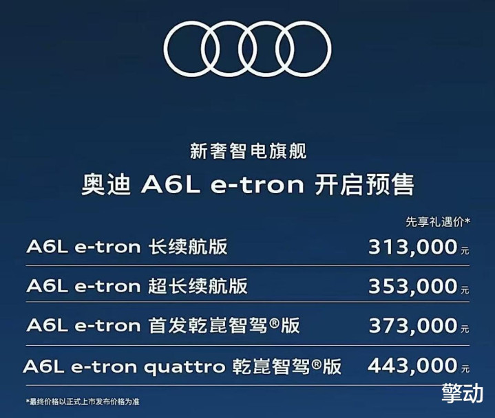 这还不是沿路,同步开启预售的奥迪A6L e-tron纯电版,预售价定在了31.3万元起,比燃油版还低廉。燃油车降价,电车订价更低廉,奥迪这波操作,用“豁出去了”来口头极少也不显夸张。